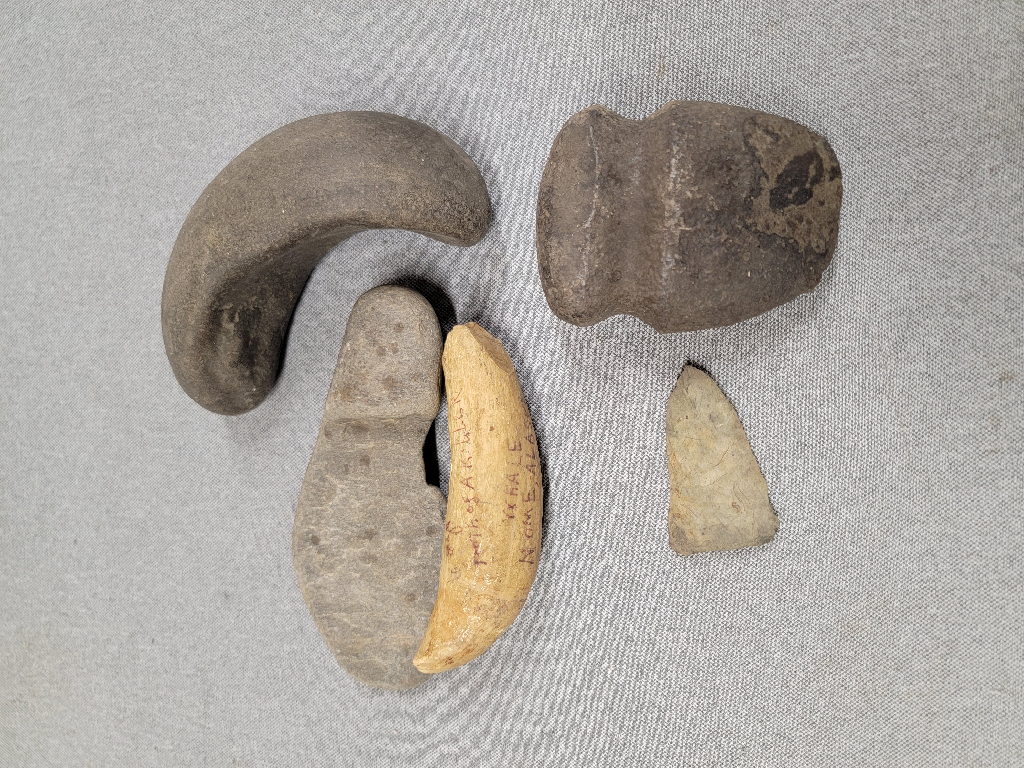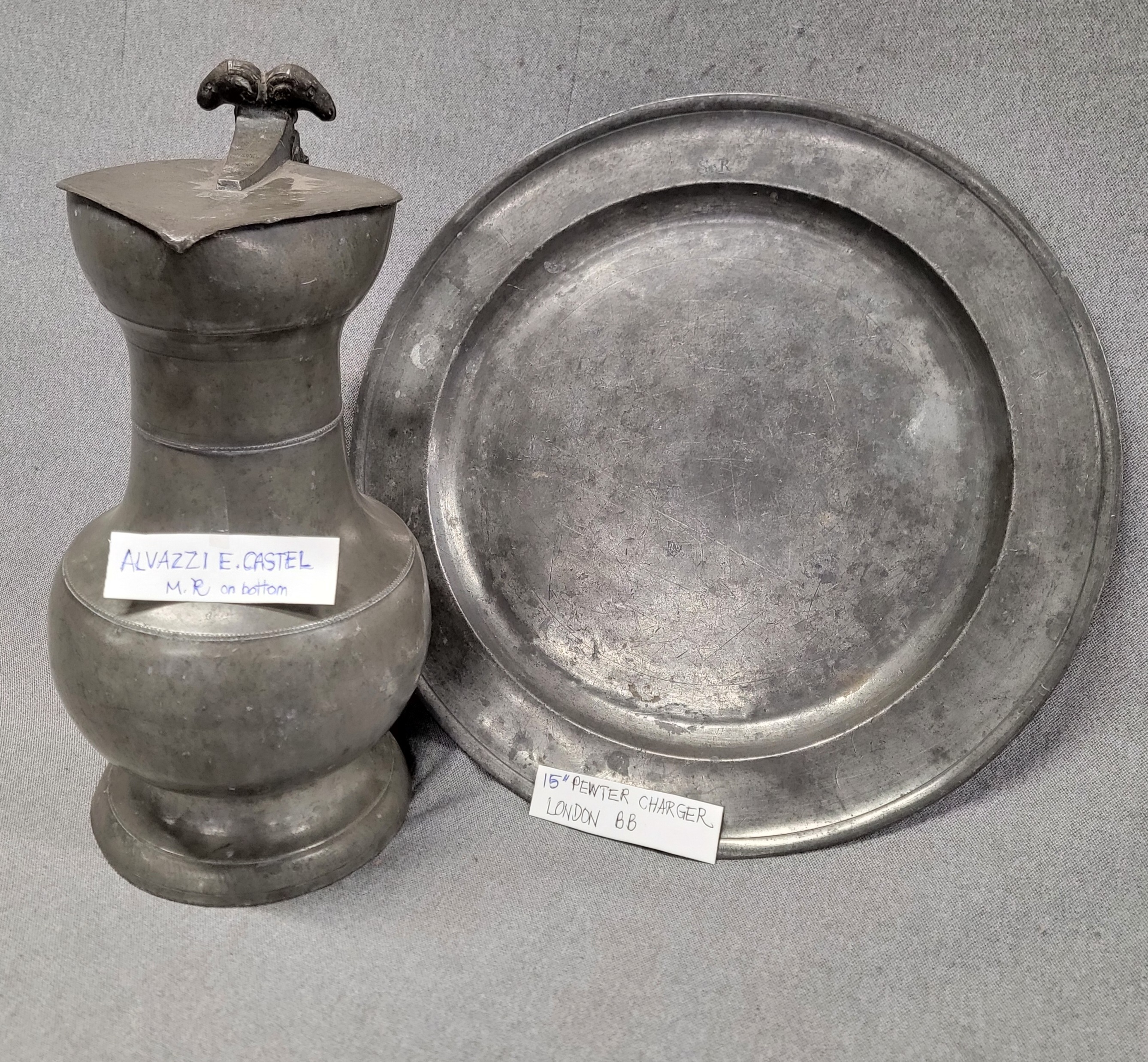 NOTABLE ITEMS sterling silver flatware set with the crown over cross hallmark and other sterling flatware pieces, a couple non-working pocket watches, working Sauer wrist watch, Alvazzi Castel pewter tankard, a 19th. c, 15" pewter charger w/ several hallmarks (London), Watling twin jackpot 5 cent slot machine (non-working), Pioneer co. heated peanut vending machine, country store Toledo scale and hanging scales, double sided "rooms for tourist" wooden sign, other wooden signs, Dazey #40 butter churn jar, vintage brass clipper ship lamp, brass nautical lanterns, (2nd half 20th. C), Handlan B&O RR lantern, brass cargo lamp, Buckeye steam whistle, Lukenheimer steam whistle, Lucas Engineering car horn, oil lamps, Coleman lanterns, barn lanterns, brass ship propeller and brass ship gauges, small fire nozzle, brass fire extinguishers, a brass 12" barrel desk cannon, 1885 Bausch & Lomb microscope in case, 2 reenactment medieval swords, killer whale tooth, stone axe head, Marx Stream Line train set in box, reverse painted game board, small area rugs, small Emerson bakelite radio, Zenith Wavemagnet radio, coffee tins, tobacco tins, some old tools, iron pulley, floor model gumball machine, some old quilts, White Bear water skis, tip ups, fishing lures with tackle box, canoe paddles, backpack, wooden bowls, vintage kitchen gadgets, 2 small Skookum dolls, vintage pennants, small stained glass windows, grouping of brass candlesticks, wooden African bust statues, oak wall phone, old desk phone, explosives box, 8 Spice Girl dolls in box and other items.