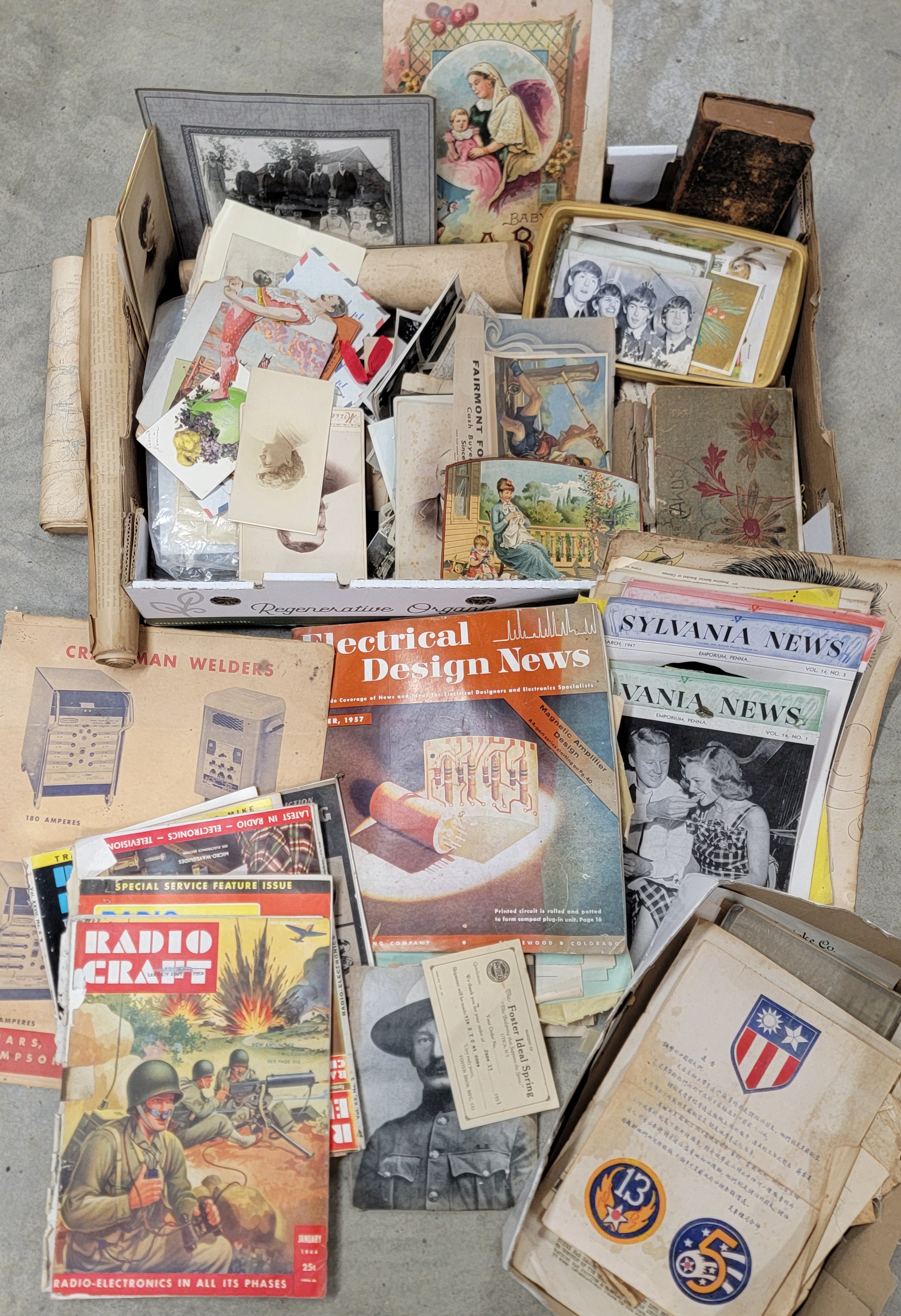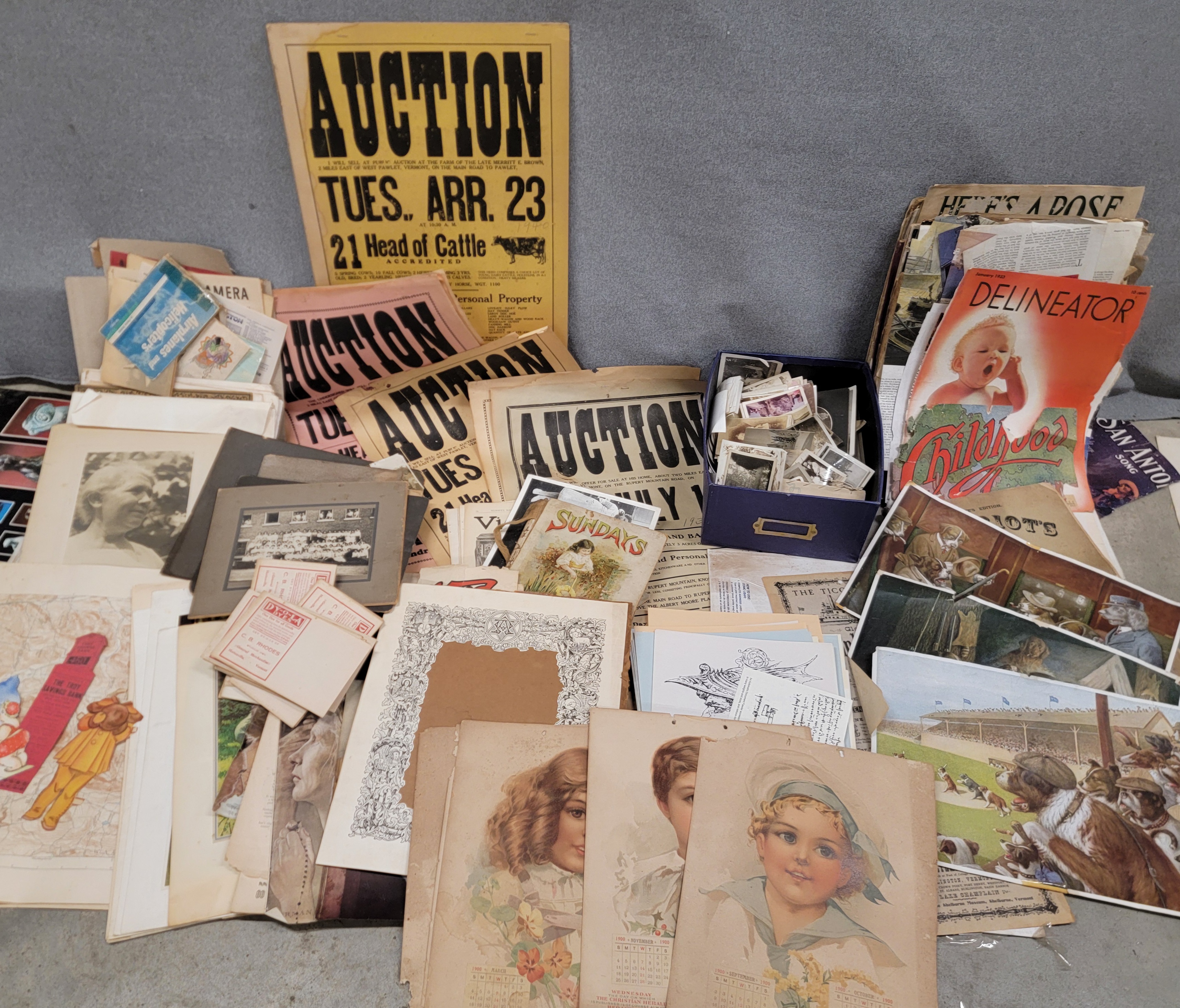 BOOKS/PAPER : autographed copy "Many a Watchful Night" by John Mason Brown 1st edition, "African Game Trails" by T. Roosevelt 1910, "Illustrated Guide to U S Missiles and Rockets" by Ulanoff 1959, album of 48 postcards of Vergennes Vt. plus other postcards included, 48 Sports Illustrated magazines (late 1960's), a grouping of 80 military related books, 1859 map of Plymouth Vt., Bridgman’s New RR &Township map of New York 1893, a large lot of ephemera from the late 19th c and early 20th c.,